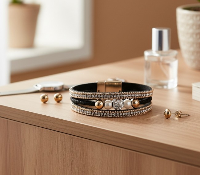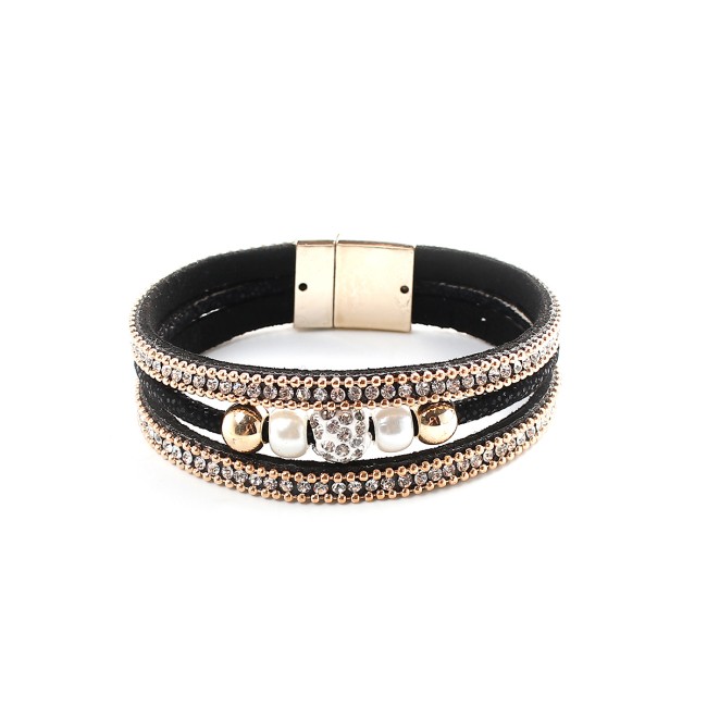 Bracelet sur cordon plat suédine noir avec strass doré et cristal , perles centrales et fermeture facile grâce au fermoir magnétique