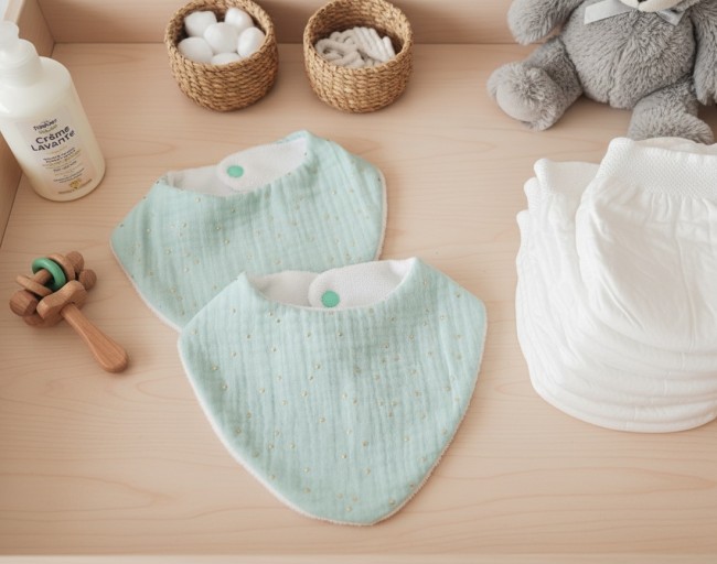 Lot de 2 bavoirs bébé double gaze vert et éponge bambou