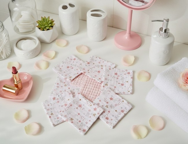 Lot de 9 lingettes démaquillantes coton étoiles et nid d'abeilles rose