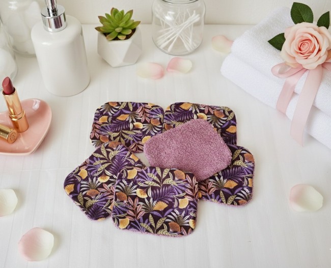 Lot de 8 grandes lingettes démaquillantes coton imprimé et éponge violet