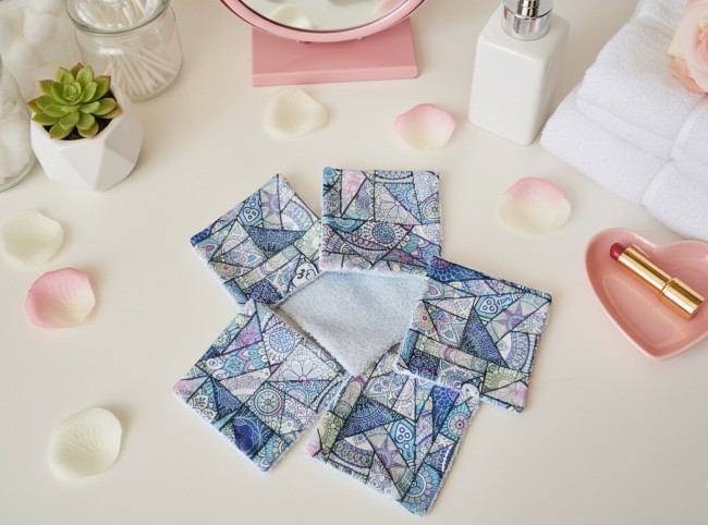 Lot de 12 lingettes démaquillantes coton imprimé et nid d'abeilles bleu
