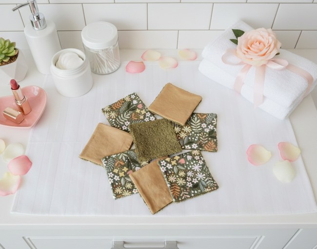 Lot de 8 lingettes démaquillantes coton imprimé fleurs et éponge kaki