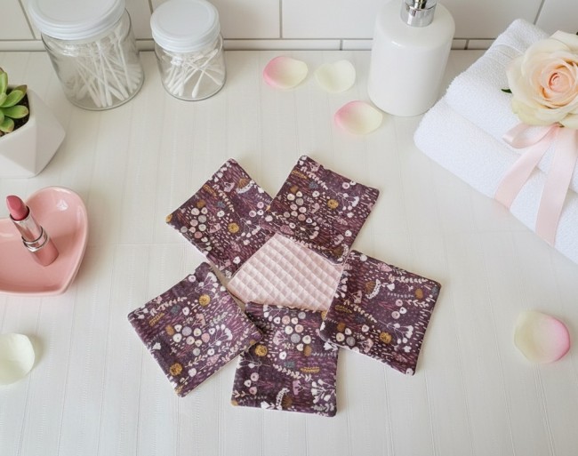 Lot de 7 lingettes démaquillantes coton imprimé et nid d'abeilles lilas