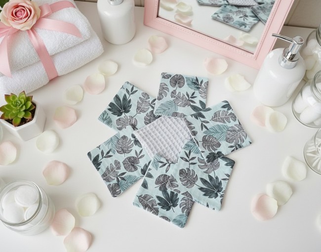 Lot de 8 lingettes démaquillantes coton imprimé fleur et nid d'abeilles vert d'eau