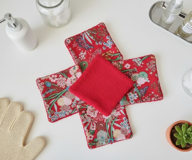 Lot de 8 lingettes démaquillantes coton fleurs et nid d'abeilles rouge