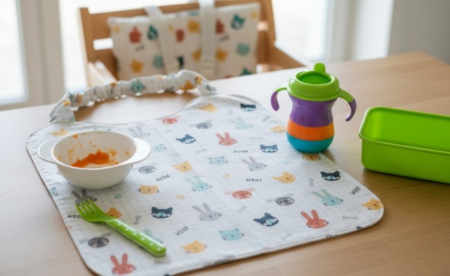 Serviette de cantine motifs bricoleurs style Playmobil et éponge blanche