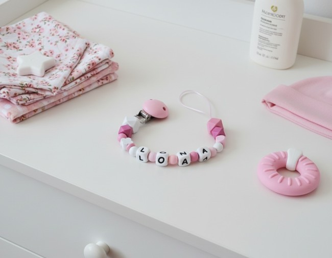 Attache tétine personnalisée perles bois et silicone blanc et rose