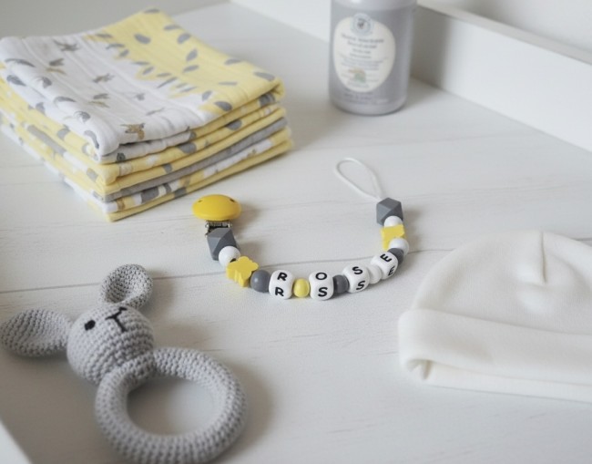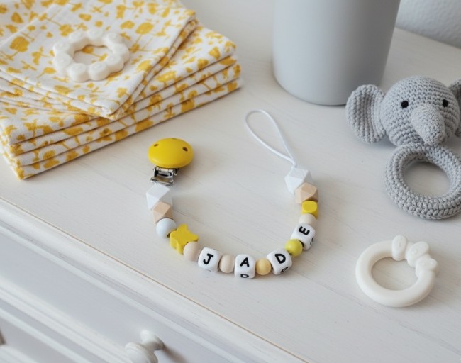 Attache tétine personnalisée perles bois silicone jaune/gris/blanc/bois