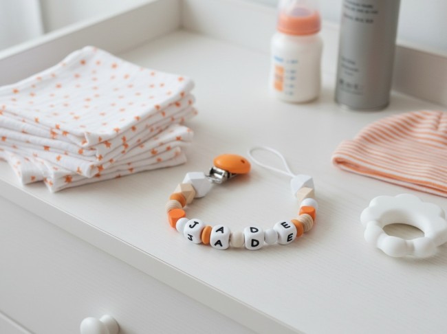 Attache tétine personnalisée perles bois et silicone blanc et orange
