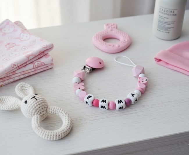 Attache tétine personnalisée perles bois rose et silicone