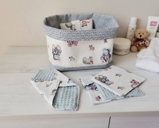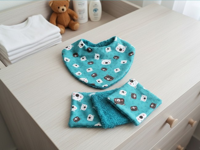 Ensemble naissance bavoir et 8 lingettes turquoise motif têtes d'ours