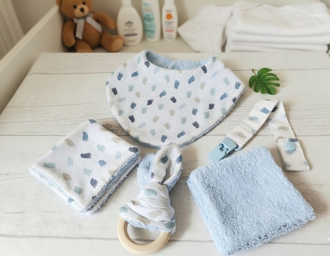 Ensemble naissance bavoir, 10 lingettes, hochet et attache tétine bleu