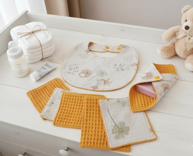 Ensemble naissance bavoir, lingettes et pochette nid d'abeilles moutarde
