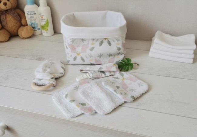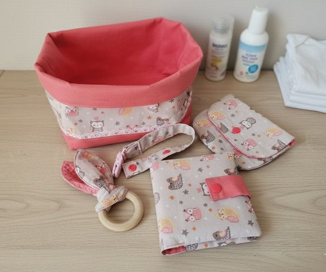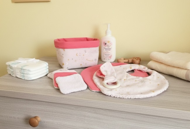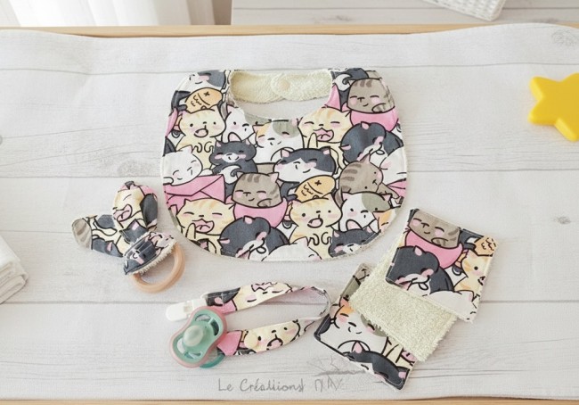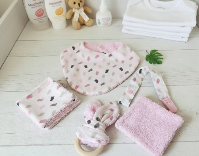 Ensemble naissance bavoir, 10 lingettes, hochet et attache tétine rose