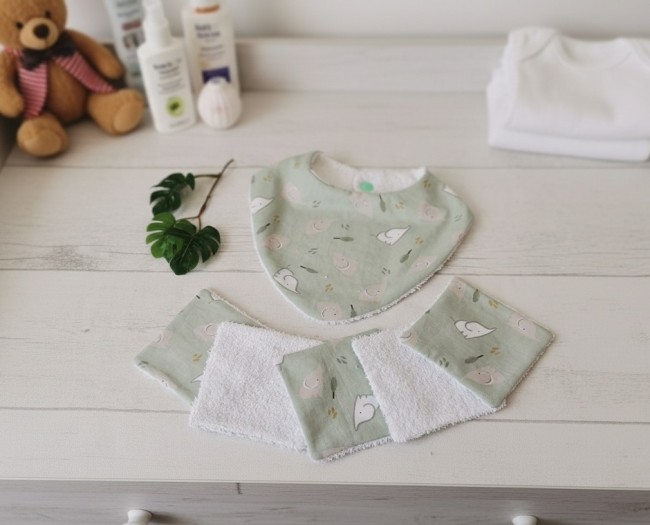 Ensemble naissance bavoir et 10 lingettes vertes motifs éléphants