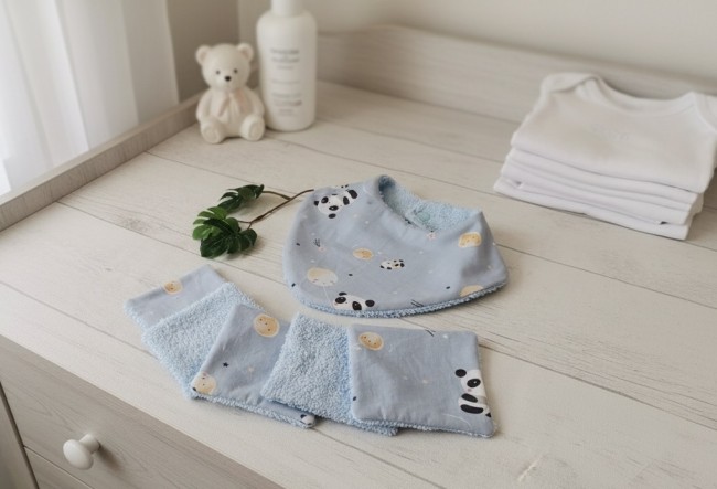 Ensemble naissance bavoir et 10 lingettes bleues panda