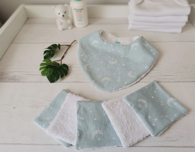 Ensemble naissance bavoir et 10 lingettes motif astres