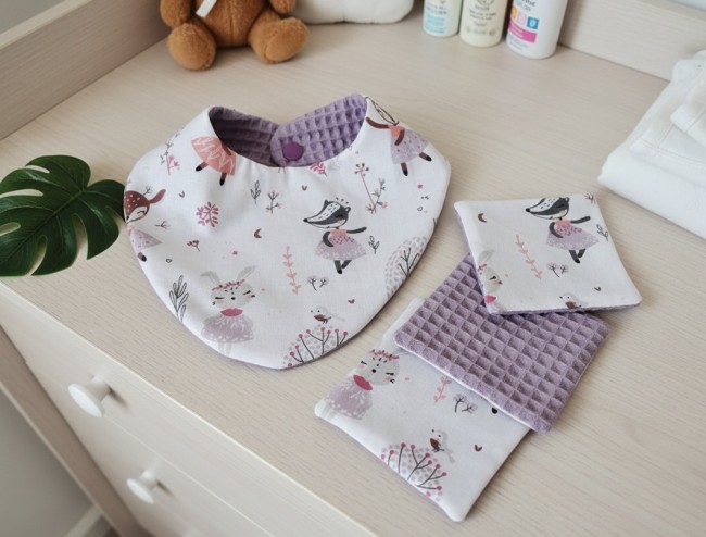 Ensemble naissance bavoir et 10 lingettes lilas motifs animaux