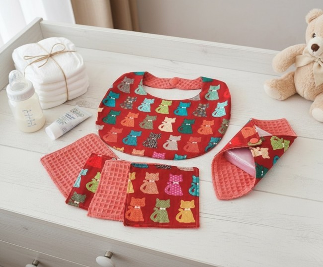 Bavoir, pochette savon et 4 lingettes nid d'abeilles corail