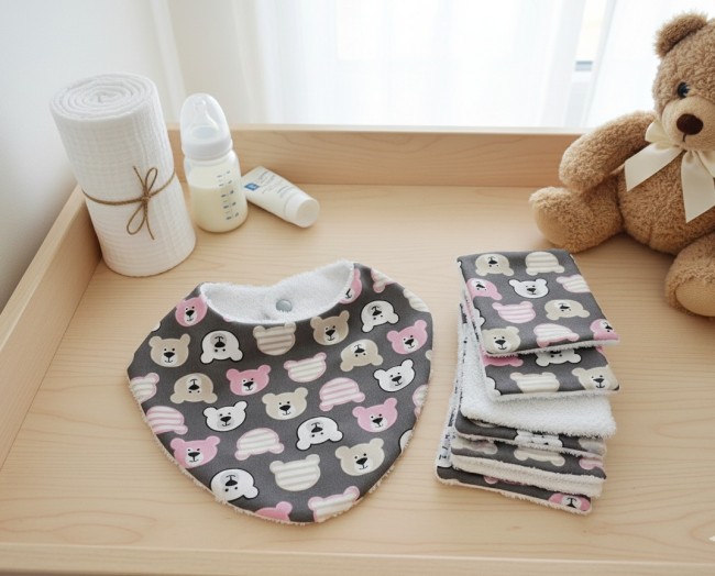 Ensemble naissance bavoir et 7 lingettes motif têtes d'ours