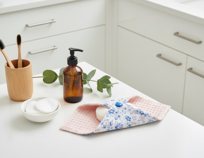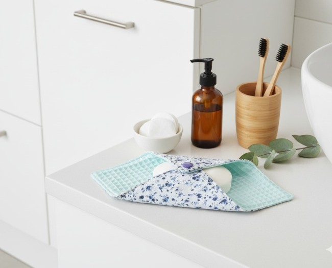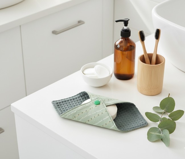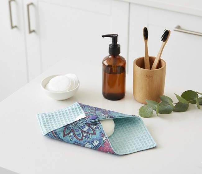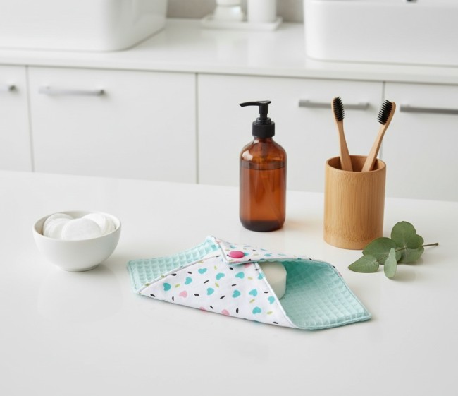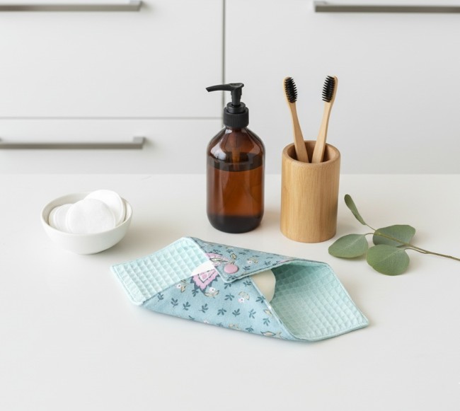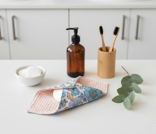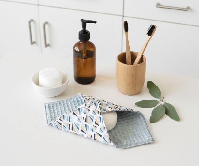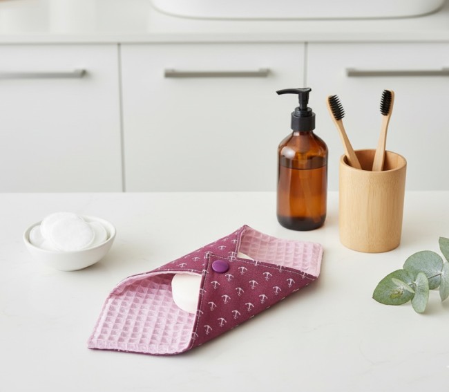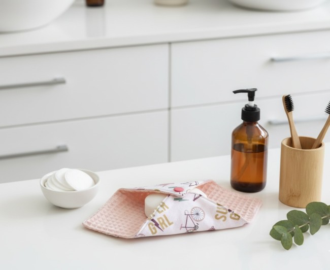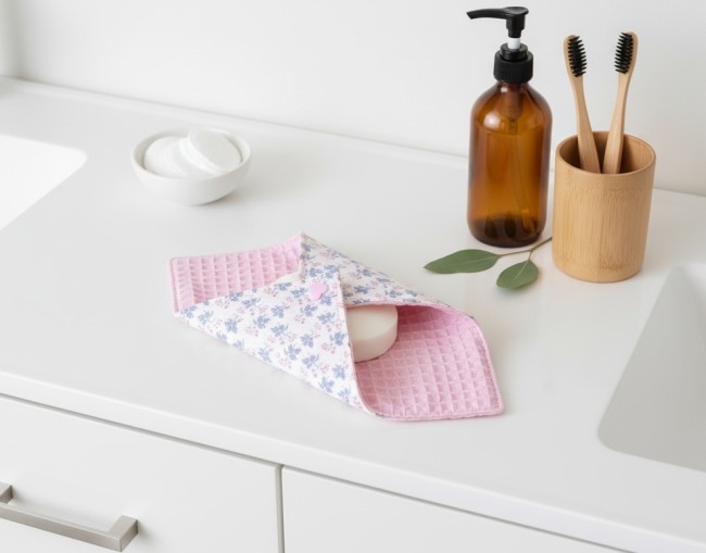 Pochette à savon coton imprimé rose géométrique et nid d'abeille beige