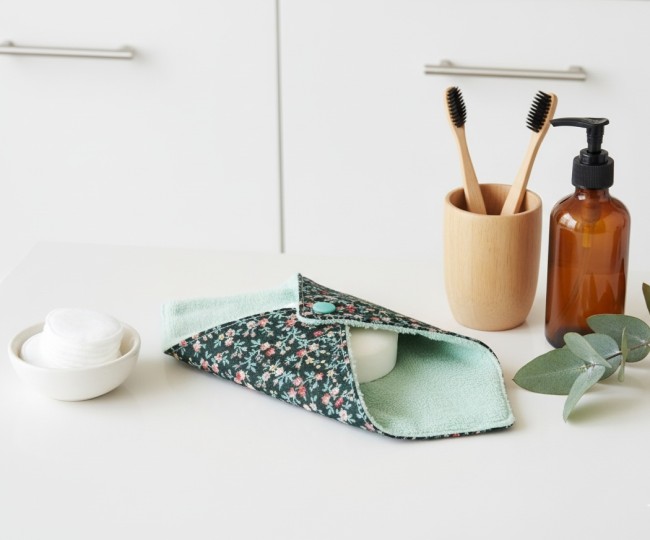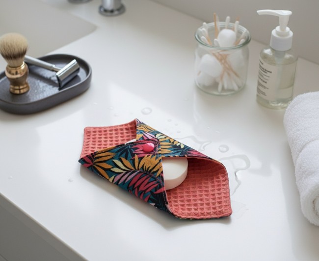 Pochette à savon tissus saumon imprimé feuilles et coton enduit rose