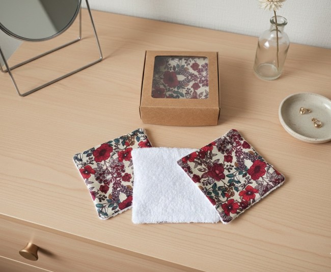 Boite de 6 lingettes démaquillantes coton imprimé fleurs rouges et éponge blanche