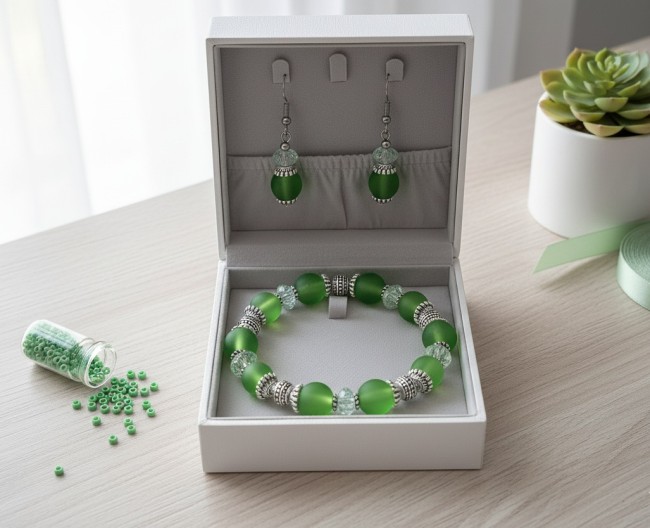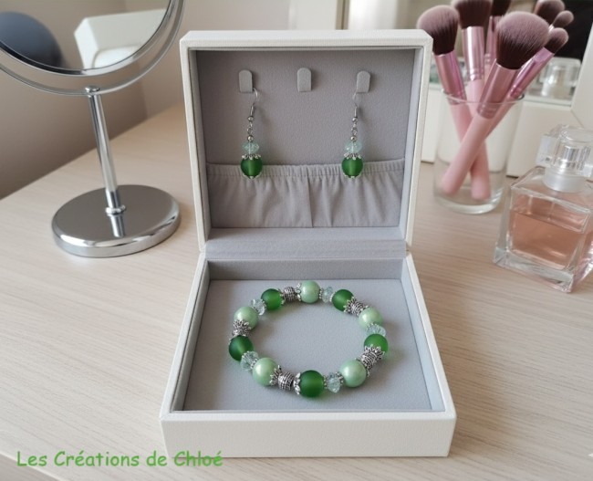 Kit parure bracelet et boucles d'oreilles perles en verre givrée verte
