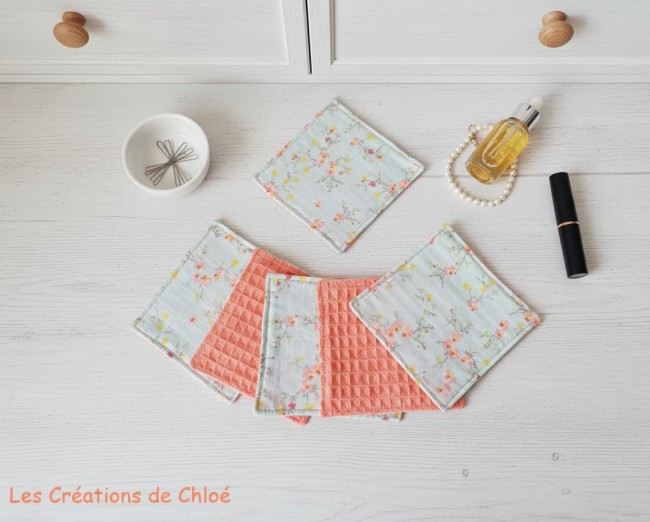 Lot de 8 lingettes démaquillantes coton imprimé fleurs et nid d'abeilles orange