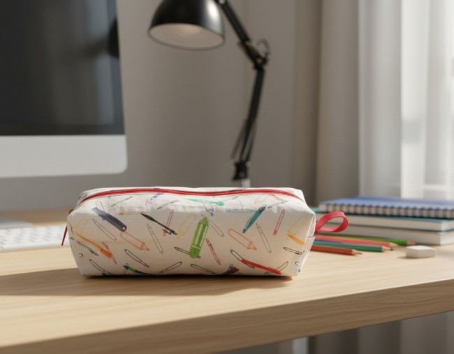 Trousse écolier fond blanc zip rouge motifs fournitures scolaires