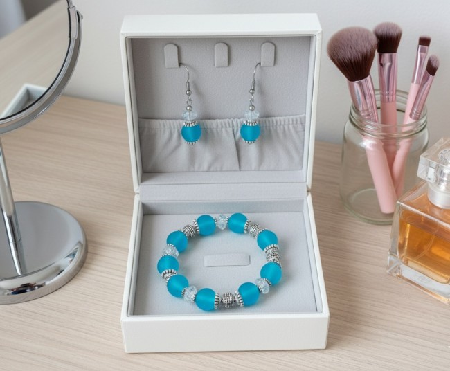 Kit parure bracelet et boucles d'oreilles perles en verre givrée bleu