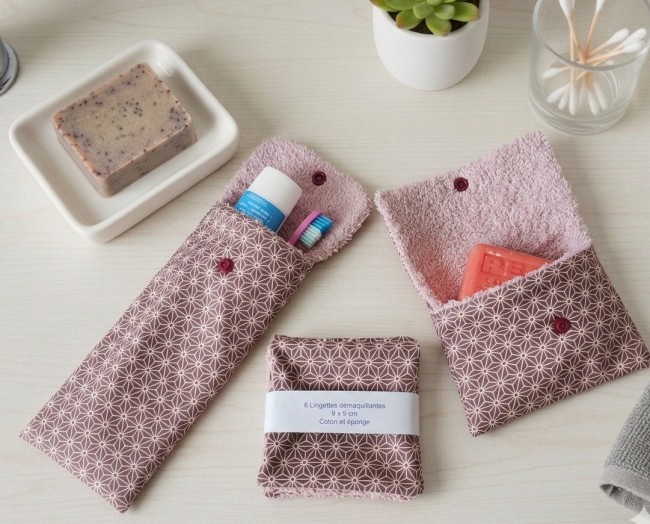 Ensemble étui brosse à dent, 6 lingettes et pochette savon prune forme géométrique