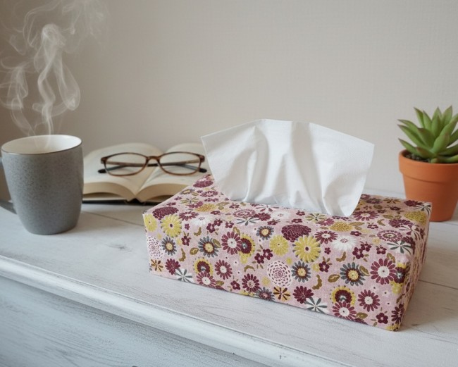 Housse pour boite à mouchoirs coton rose et fleurs blanches