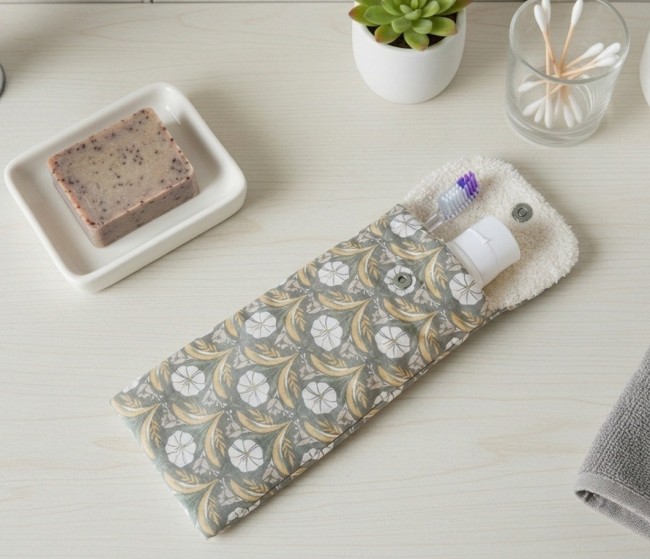 Etui brosse à dent et dentifrice coton fleur blanche et éponge beige
