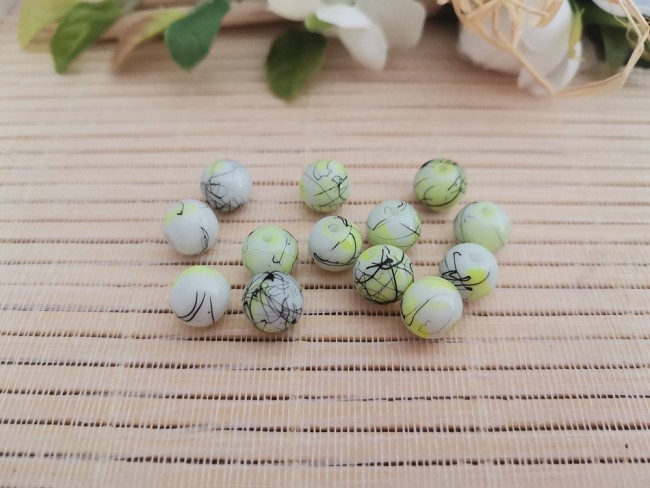 20 Perles en verre 8 mm blanc, vert fluo et tréfilé noir