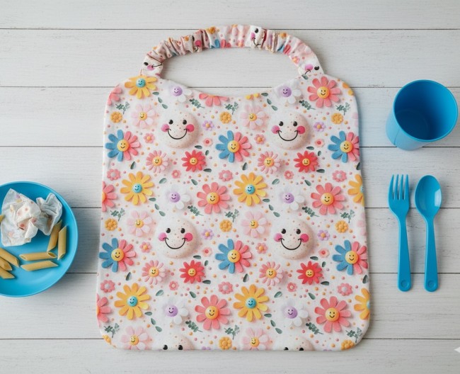 Serviette de cantine motifs fleurs smiley 3D et éponge blanche