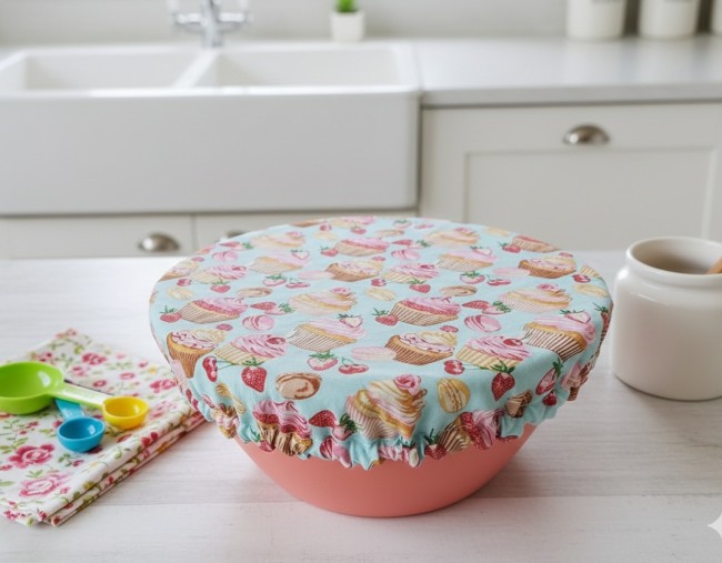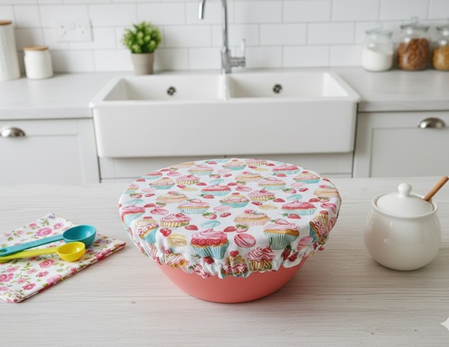 Charlotte alimentaire coton motifs divers gâteaux doublé tissus enduit beige