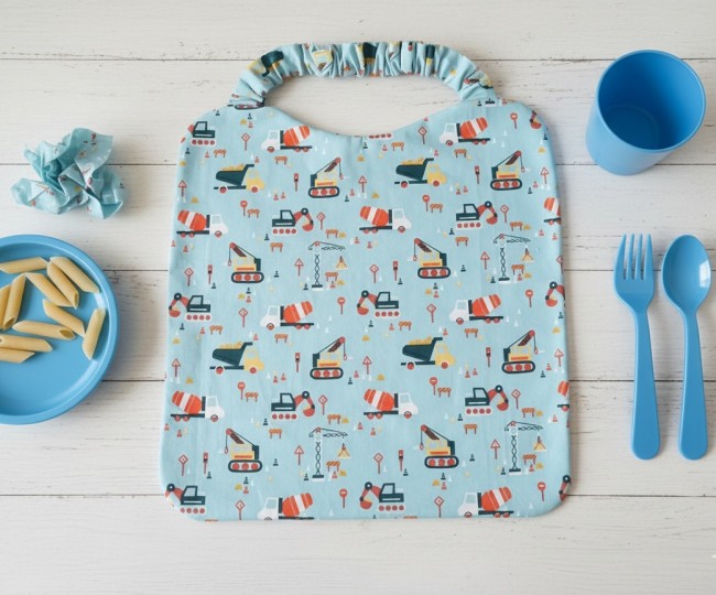 Serviette de cantine coton blanc motifs engins de chantier et éponge blanche