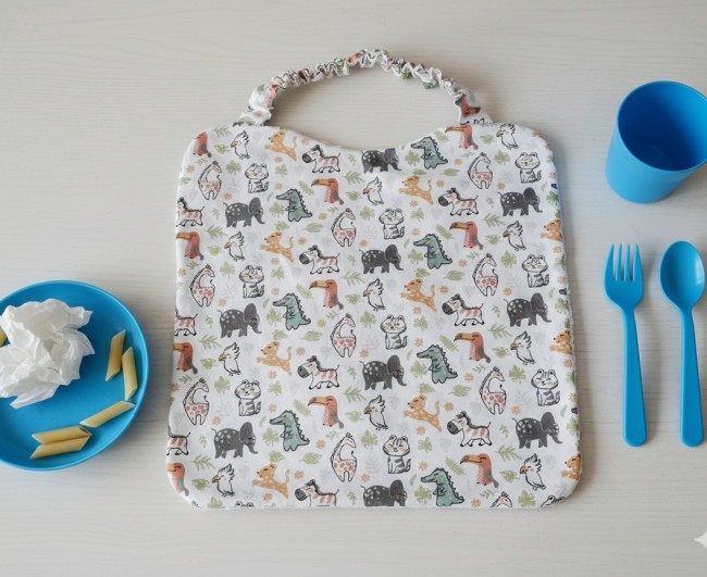 Serviette de cantine coton bleu motifs insectes et éponge blanche