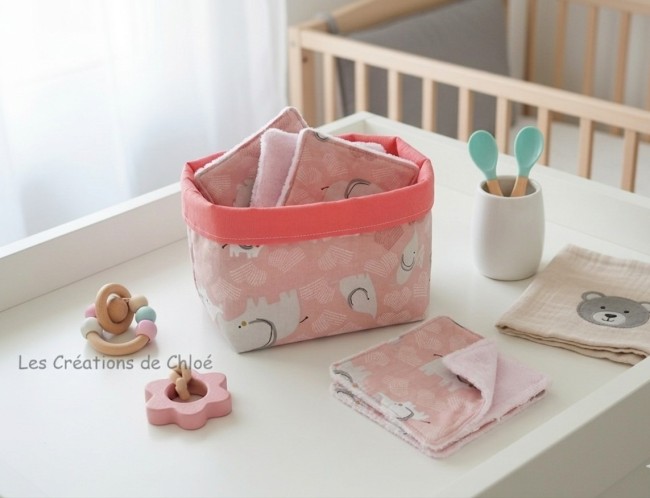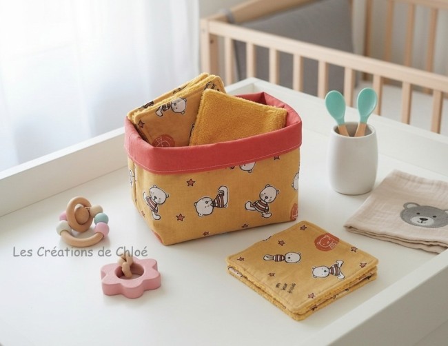 Panier et 6 lingettes bébé couleur corail et moutarde