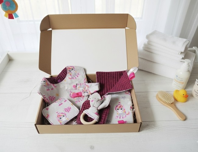 Coffret naissance/box naissance bavoir, doudou, hochet, attache tétine et 10 lingettes violet/licorne