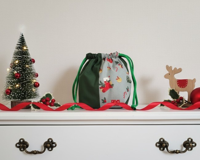 Petit sac pochon de noël à lien coulissant couleur vert motif divers