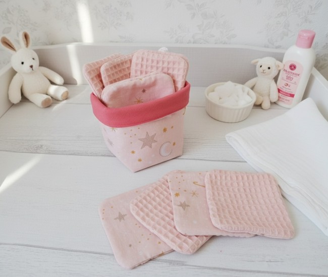 Panier et 6 lingettes bébé couleur rose et saumon