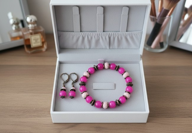 Parure bracelet et boucles d'oreilles fuchsia et cuivre rouge