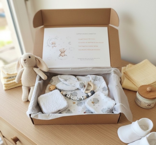 Coffret naissance/box naissance 8 lingettes tissus beige et lapins