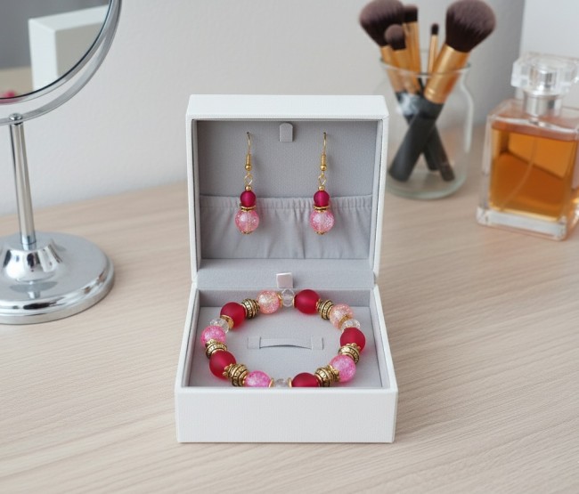 Parure bracelet et boucles d'oreilles rose/rouge et doré