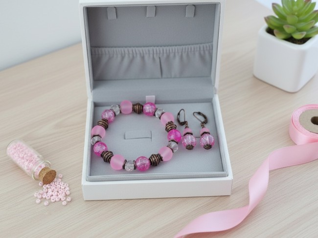 Parure bracelet et boucles d'oreilles rose et cuivre rouge