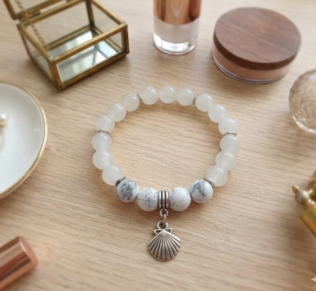Bracelet perles en verre imitation jade blanche et breloque coquillage