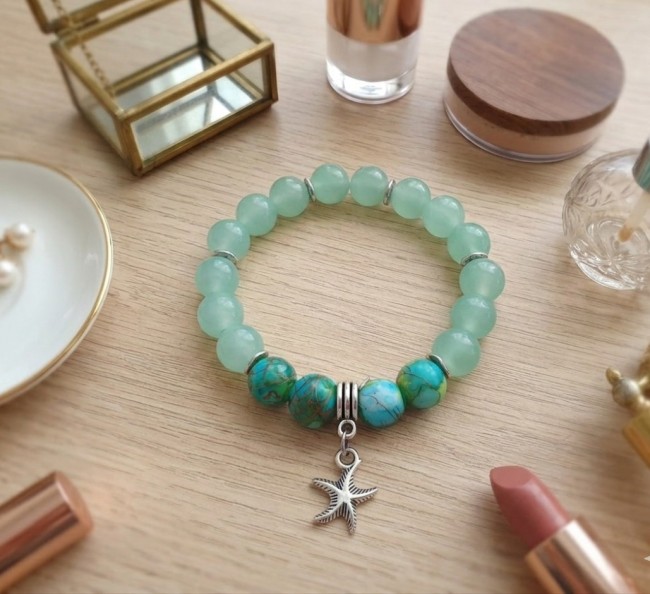 Bracelet perles en verre imitation jade vert d'eau et breloque étoile de mer
