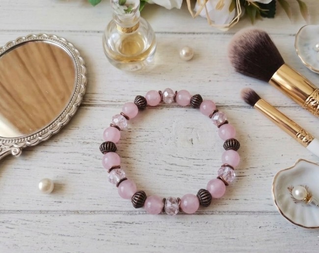 Bracelet fil élastique avec perles en verre rose et apprêts cuivre rouge